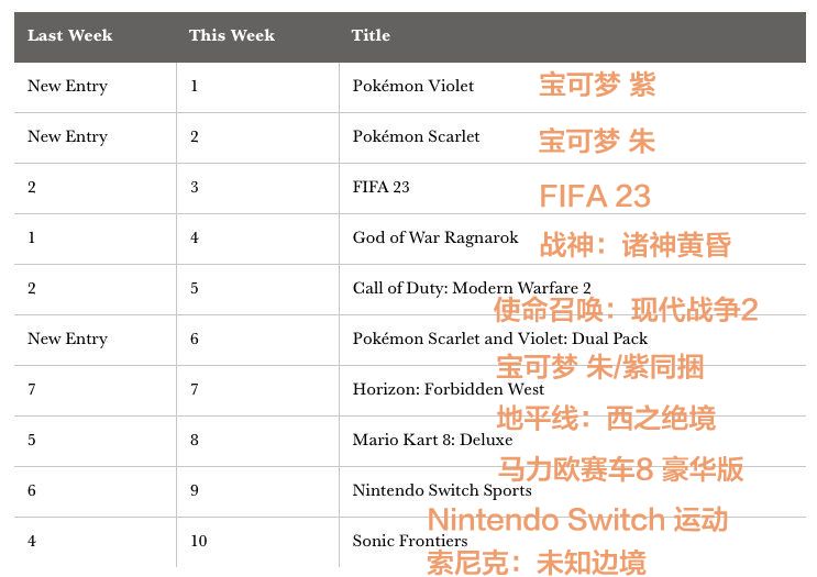 第九世代正作《宝可梦 朱/紫》在上周获得了英国游戏零售市场的盒装销量前二名,《宝可梦 紫》占52%,《宝可梦 朱》占42%,6%为双版本同捆包。