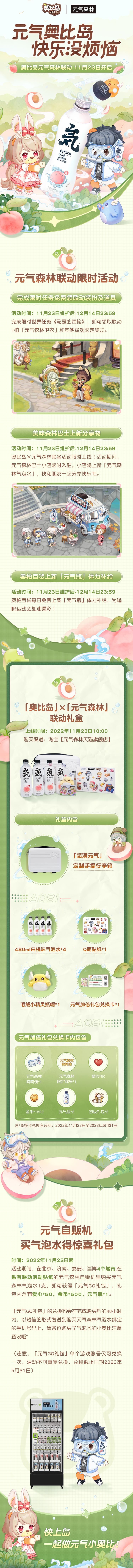 ⭐奥比岛x元气森林联动礼盒也将在11月23日惊喜上线,购买联动礼盒可同时解锁游戏内定制装扮和道具哦!