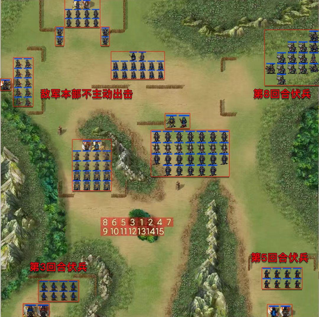 注意点:第3/5/8回合敌军分别会出现伏兵,需要提前准备好,敌军本部三个部队不会出击,敌军前军两个大方阵,回合初会全部出击。依次清理即可,本关无难点,根据地形选择蜀、魏武将出战。