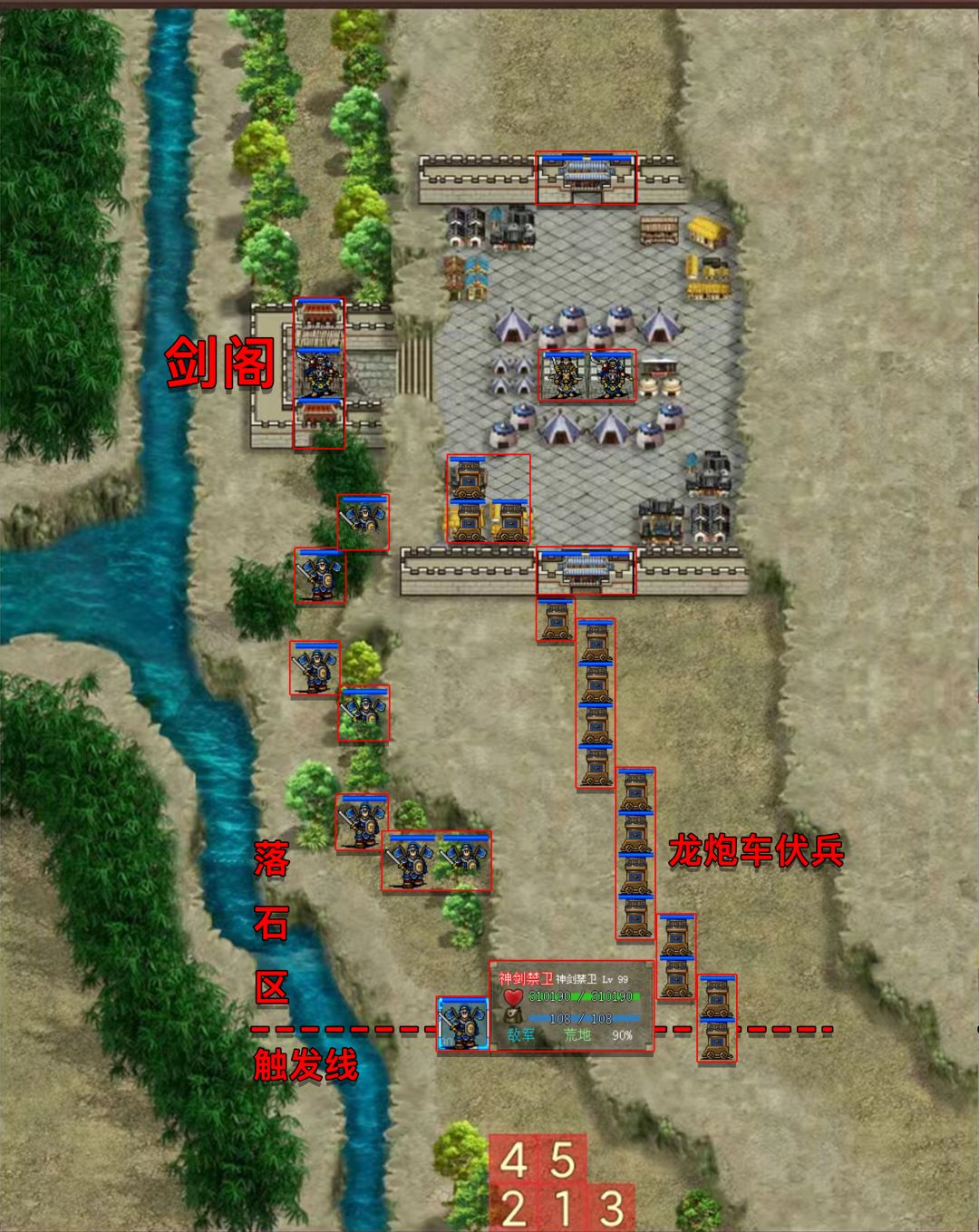 3.越过触发线会出现龙炮车伏兵并引发落石,消灭伏兵落石不会消失,落石在每回合初初对越线武将造成999伤害,如果我方武将不向上或向下移动2格,则该武将下一回合落石伤害达到9999