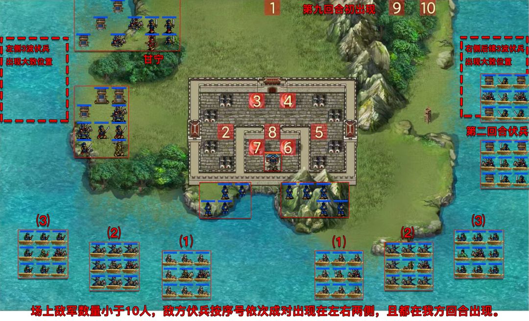 4.场上敌军数量少于10人,敌军伏兵成对出现在左右两侧,依次是凌统/丁奉,徐盛/全琮,朱然/诸葛瑾,所有伏兵均出现在我方回合