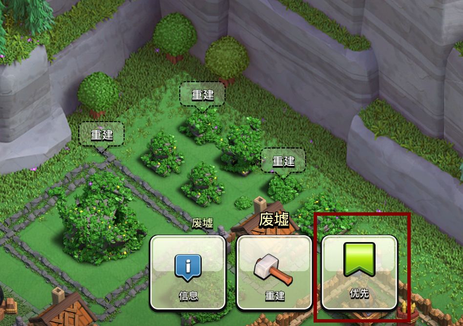 升级顺序:进攻型废墟>防守型废墟>障碍物(露营地和大森林)