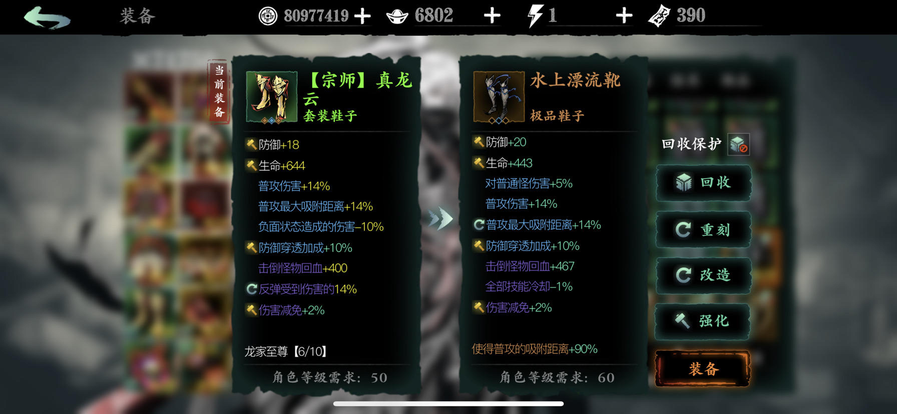 第二点要注意的是,可以装双返璞归真套装,也就是50级+60级套装,但伤害相差不大,所以不推荐(就不上图了),还可以将脚换成一个金色装备“水上漂流靴”,如下图