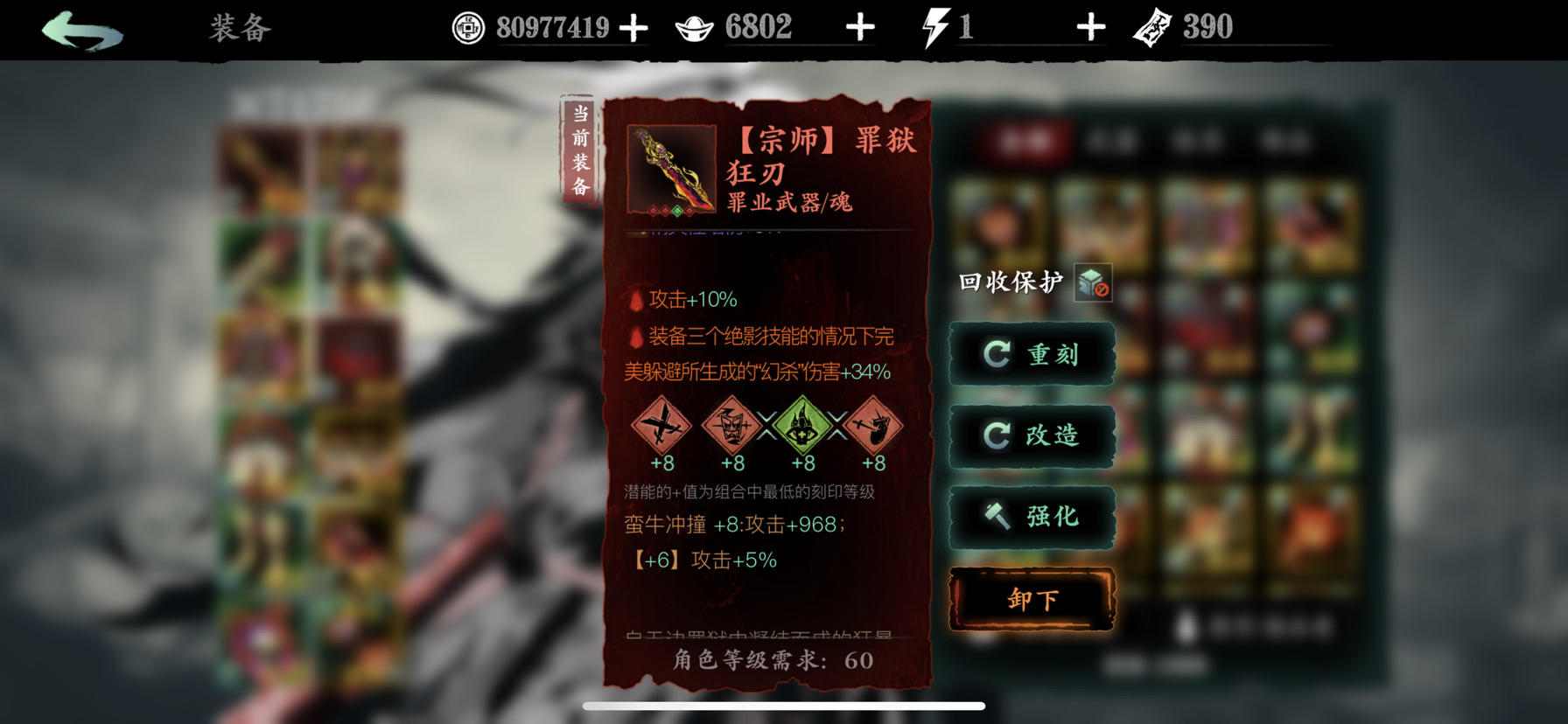 2. 既然是普攻流,所以橙武都不适合,改用罪业武器,吞噬属性有一项最重要,就是主手武器中的“攻击+10%”,其它影响不大;