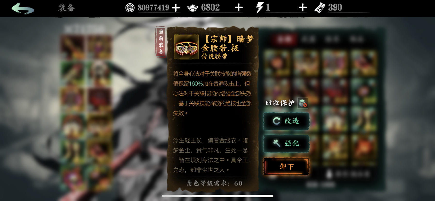 4. 暗梦羽衣、暗梦金腰带、罪业护手三件装备配合使用,因为既然是玩普攻流,那么就不会使用技能,所以可以不用装备技能,另外,罪业护腕的吞噬属性,就是当你技能链上的空位越多,普攻伤害越高,所以这更是让你不装技能,同时再加上暗梦金腰带的属性,可以将心法的技能伤害加成到普攻伤害上;