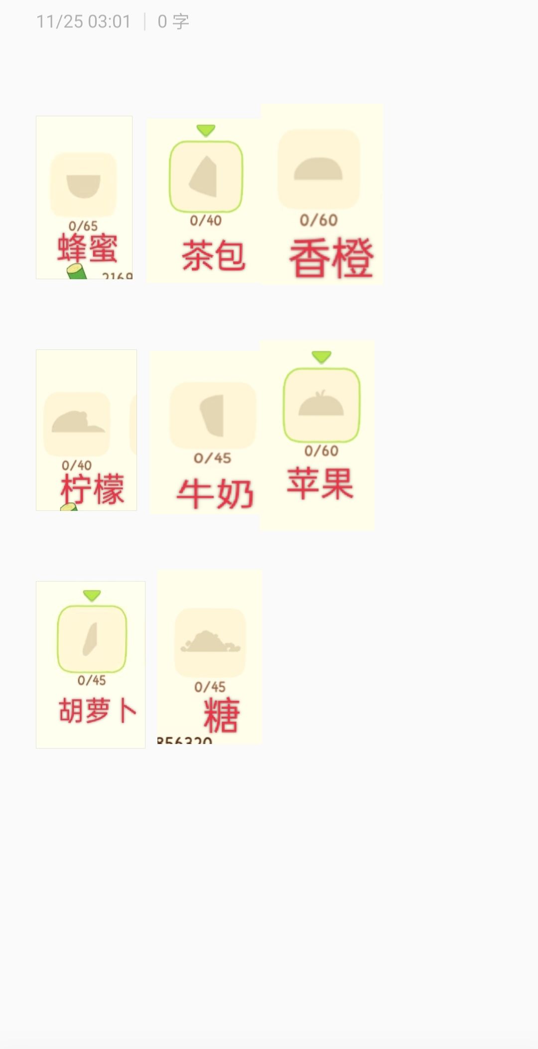 菠萝(酸酸甜甜\不生长在牧场),香橙(一瓣两瓣\圆圆的),红枣(不是绿色的),红茶包(红色的\不生长在牧场),糖(图片)