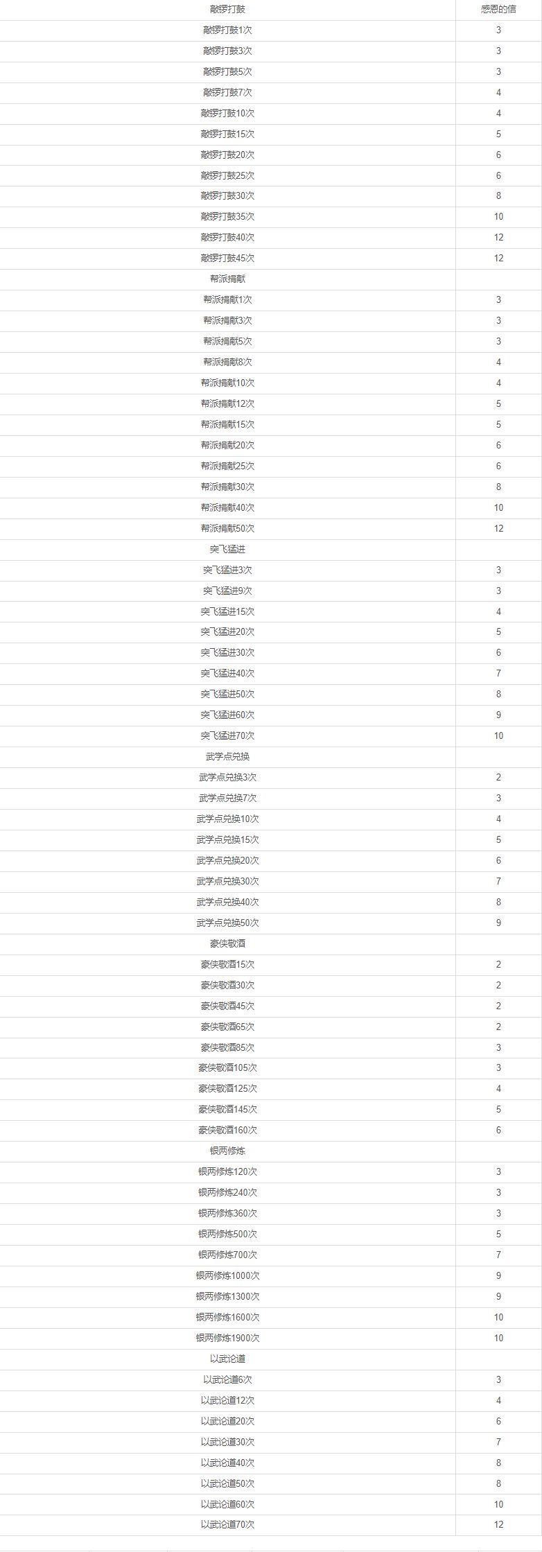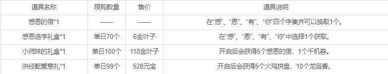 活动期间,通过“江湖磨砺”挂机,在挂机次数内必定掉落“感”、“恩”、“有”、“你”集字道具中其中1个,集齐四个字可兑换道具“感恩的信”,收集“感恩的信”可以兑换各式好礼。除此之外,大侠们还可以选购“小师妹的礼盒”与“洪经乾爱意礼盒”,以优惠的价格获得感恩的信、千机券、龙涎香等道具。