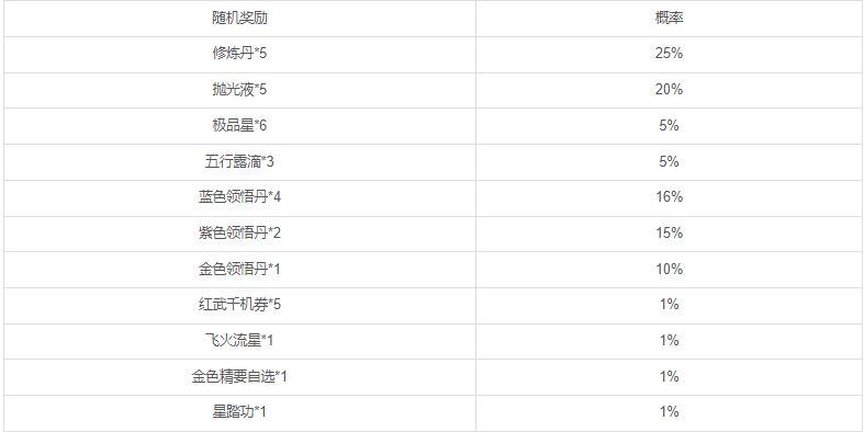 随机奖励:有概率可获得修炼丹,抛光液,极品星,五行露滴,蓝色领悟丹,紫色领悟丹,金色领悟丹,红武千机券*5,飞火流星,金色精要自选,星踏功;