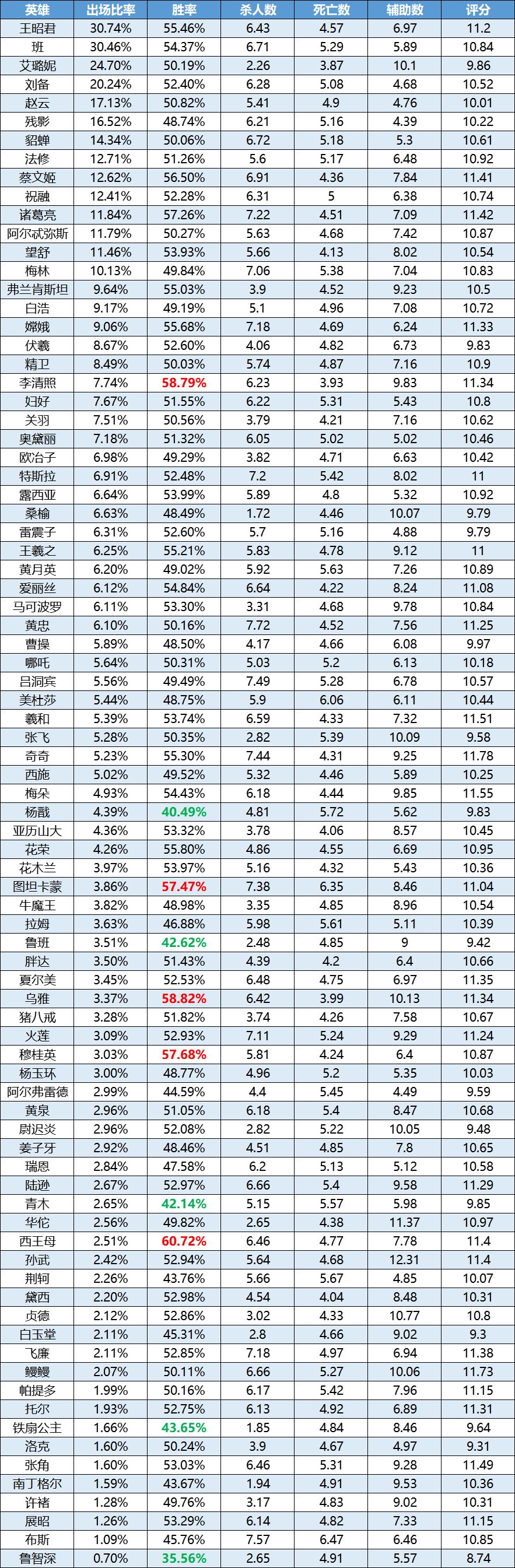 注:此榜单按出场率由高到低排序,标红为胜率前5的英雄,标绿为胜率排名倒数的英雄