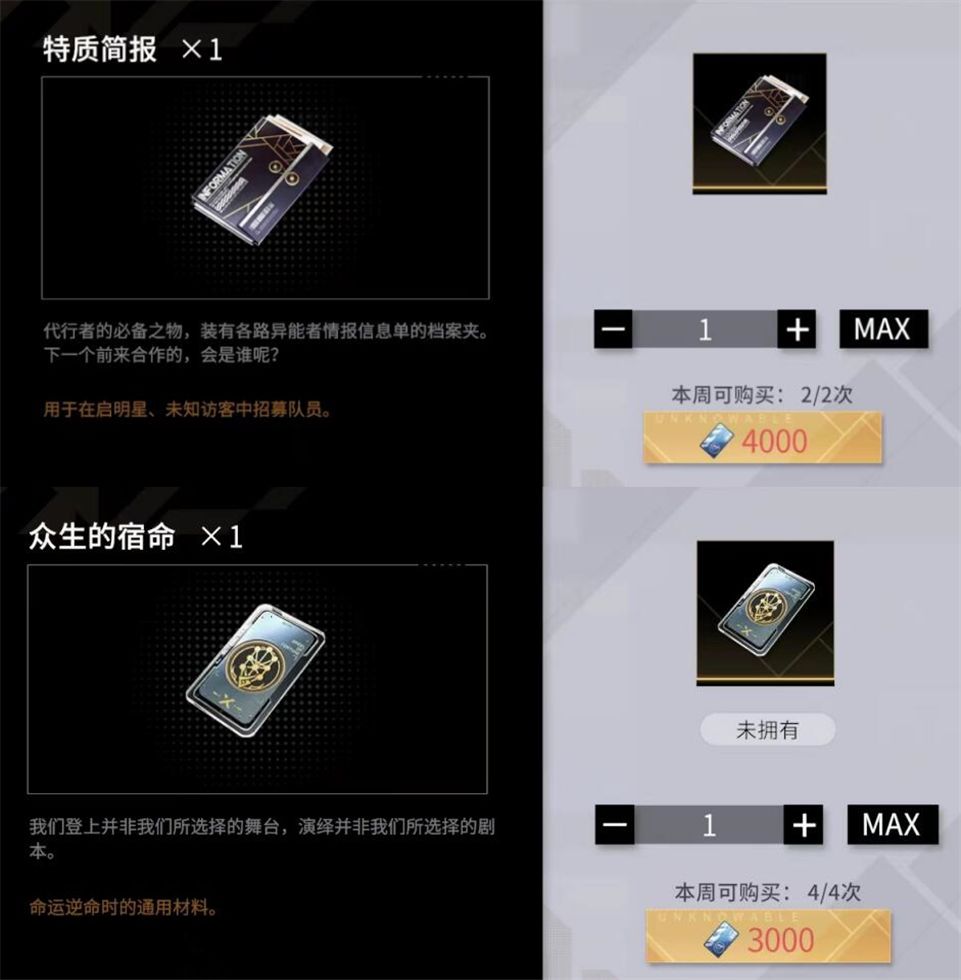 特质简报*1:用于启明星,未知访客中招募队员,每周可购买2次,单次购买消耗4000协会贡献。