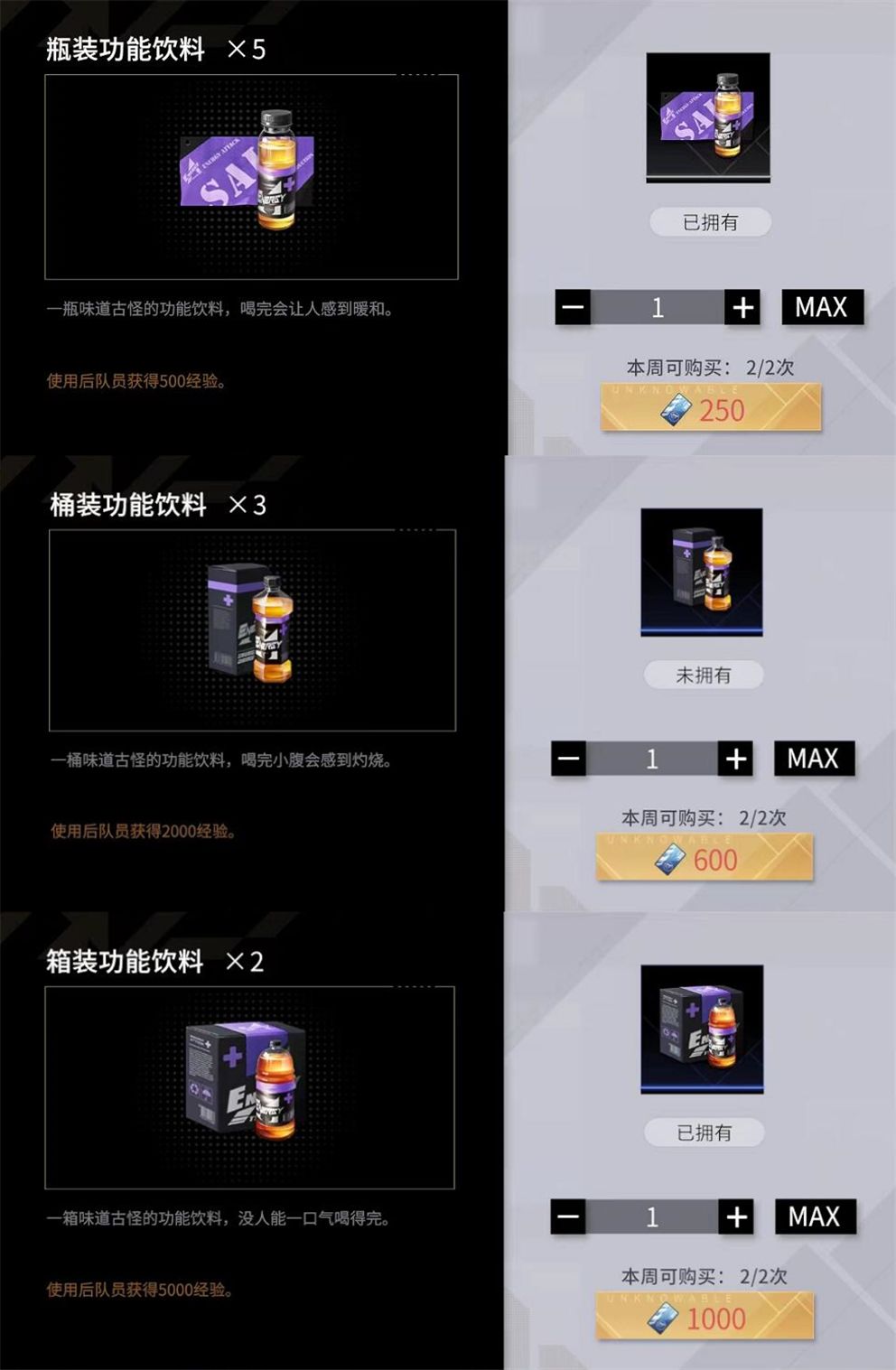瓶装功能饮料*5:使用后队员获得500经验,每周可购买2次,单次购买消耗250协会贡献。