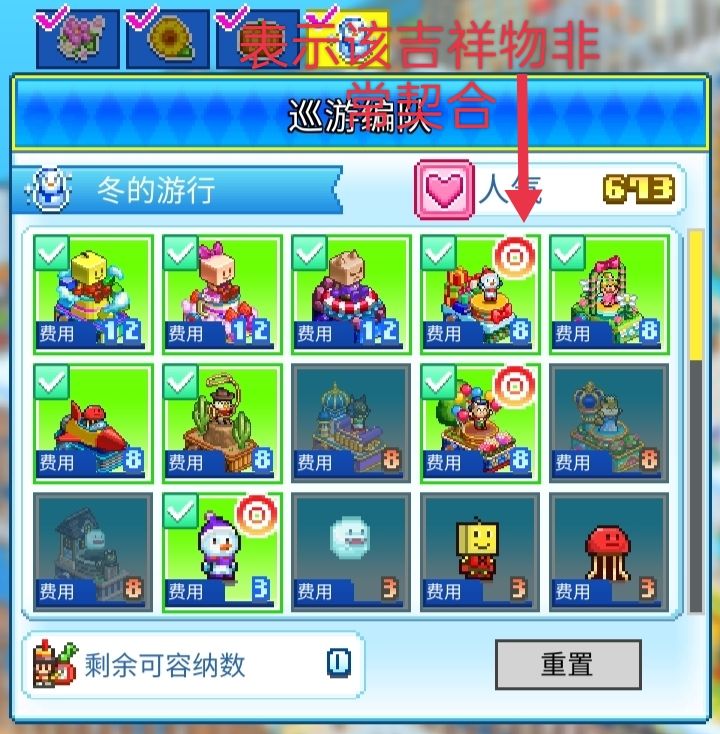 (˵¯͒〰¯͒˵) 每年的秋季下午四点,会开启吉祥物的签约,选择一个吉祥物,然后抽签,抽签赢了就可以进入吉祥物的签约界面,因为抽签是随机的,所以在快要到下午四点的时候,建议保存游戏,如果抽签失败了,直接重启游戏,再抽亿次(只要你重启次数够多,抽签就不可能输,傲娇脸.jap),成功签约吉祥物后会解锁区域功能(鬼魂除外,鬼魂解锁的鬼屋属于大型游乐设施,所以第一只吉祥物不推荐选鬼魂),同时还会解锁设施“游行”,建造游行,就能进行花车队巡游了,花车会在吉祥物二级解锁,在此之前只能辛苦吉祥物用双腿游行了(开罗君二级解锁的是开罗姬花车,三级才解锁开罗花车,毕竟是大哥大,就是不一样~),需要注意的是,每个季节契合的吉祥物都不一样,所以每次换季,记得第一时间更换游行队伍,把契合季节的吉祥物换上去