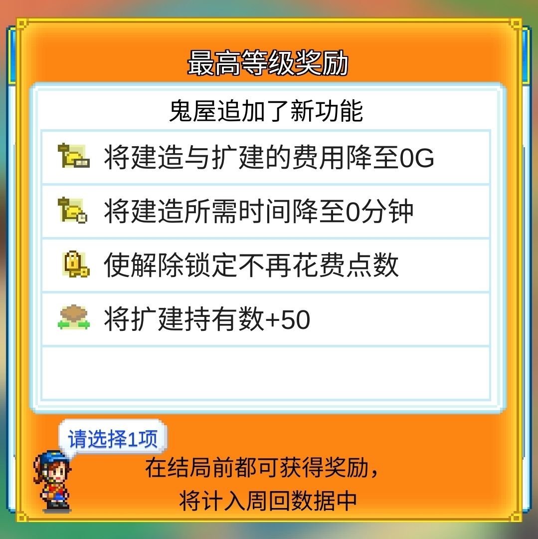 前面两条相信不用我解释了,第三条的作用是在你游玩到第13年游戏结算后,如果你点击从头开始,算作二周目,在这里解锁该设施不再消耗情绪点数;第四条是可以扩建的设施才会有的选项,作用是提升50的扩建面积。