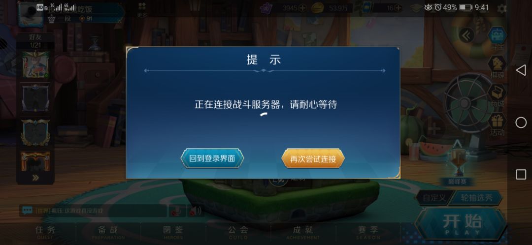 一局游戏蹦了两次,在游戏中怎么都重连不上,第一次蹦在第三回合,等退出游戏在重进就九回合了,第二次也差不多,游戏中我忙着重连没想着截图,但是第二次进去游戏后在主界面还在转圈,我就截了个图,尝试重连是不存在的,只能重新登录,说实话,能在这种情况下我狗到第三我感觉我是玩的真好
