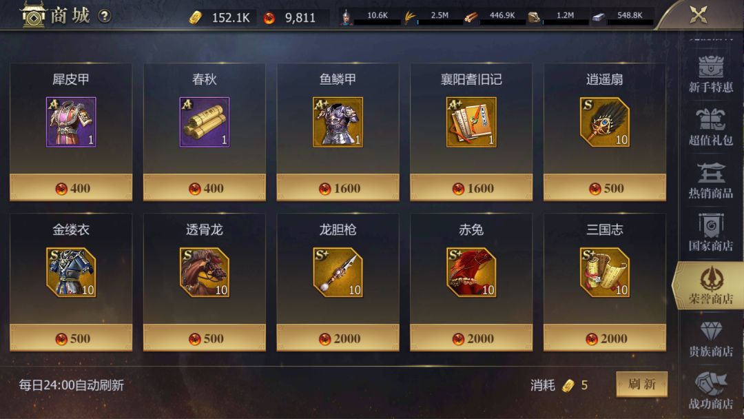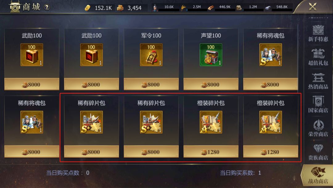 四、商城-战功商店,参与的国战活动越多,战功越高,就可以购买更多的装备碎片。
