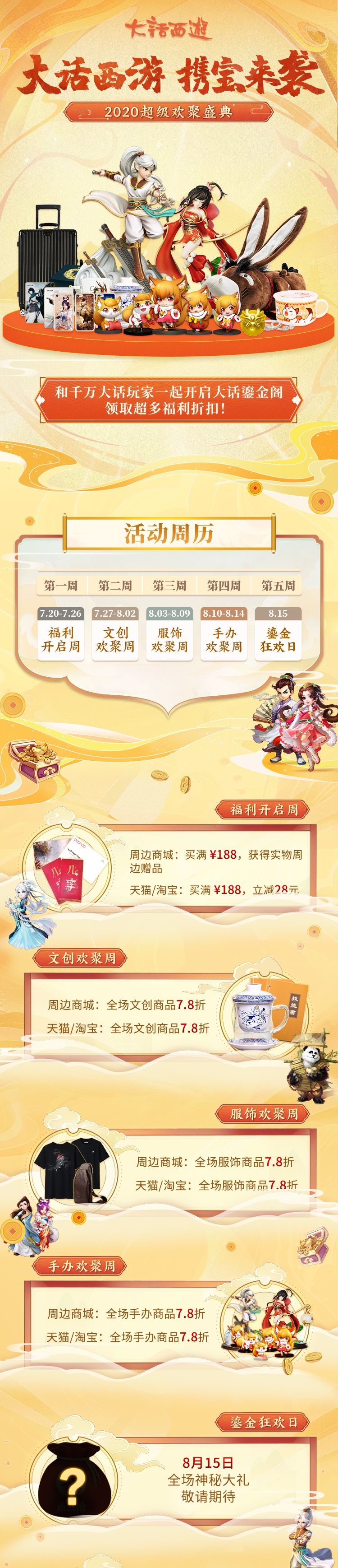 之后不仅每周都将有福利活动登陆大话周边商城,8月15日更将有全场神秘折扣活动,敬请期待!