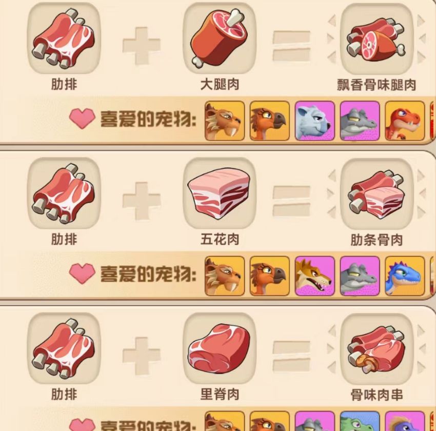 10、肋排 + 肋排 = 清香肋排,喜爱的宠物:剑齿虎,骇鸟,金卡纳鳄,牛龙,朱雀11、肋排 + 大腿肉 = 飘香骨味腿肉,喜爱的宠物:剑齿虎,骇鸟,短面熊,金卡纳鳄,霸王龙,朱雀12、肋排 + 五花肉 = 肋条骨肉,喜爱的宠物:剑齿虎,骇鸟,安氏中兽,金卡纳鳄,年兽,朱雀,鲨齿龙13、肋排 + 里脊肉 = 骨味肉串,喜爱的宠物:剑齿虎,骇鸟。金卡纳鳄,迅猛龙,朱雀,澳洲魔龙