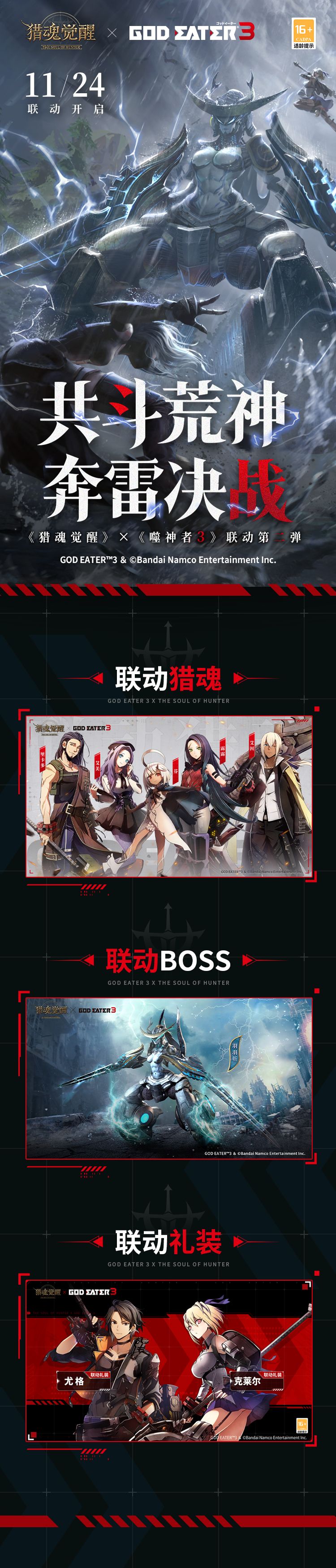 网易超真实团队狩猎手游《猎魂觉醒》与万代南梦宫娱乐动作冒险人气大作《噬神者3》重磅联动来袭,将于11月24日开启!联动第二弹内容汇总出炉,本次联动的精彩内容、超值福利一网打尽,一起来看看吧!