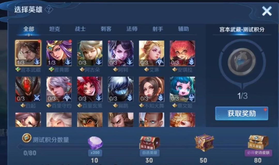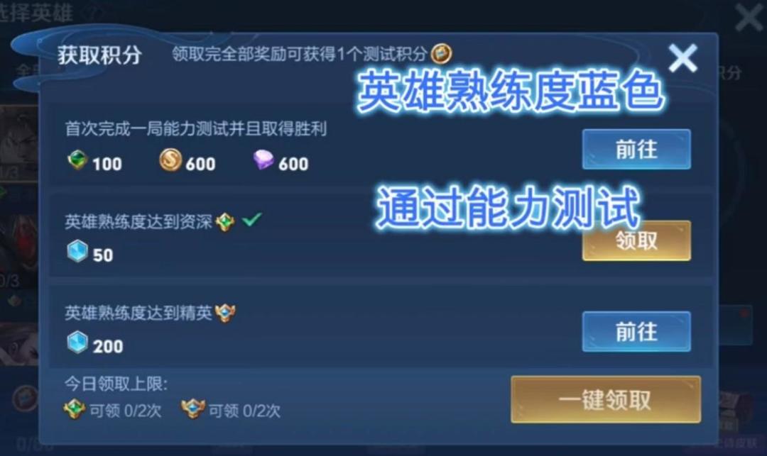 每当一个英雄熟练度达到蓝色,再用这个英雄完成能力测试,就可以获得一个测试积分,同时还能获得金币、钻石、铭文碎片的奖励,还是挺不错的。但是因为这个“蓝色熟练度奖励”是有上限的,每天最多领取两次,所以最快需要40天才能拿到80个积分。