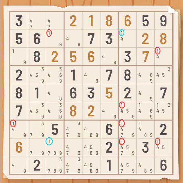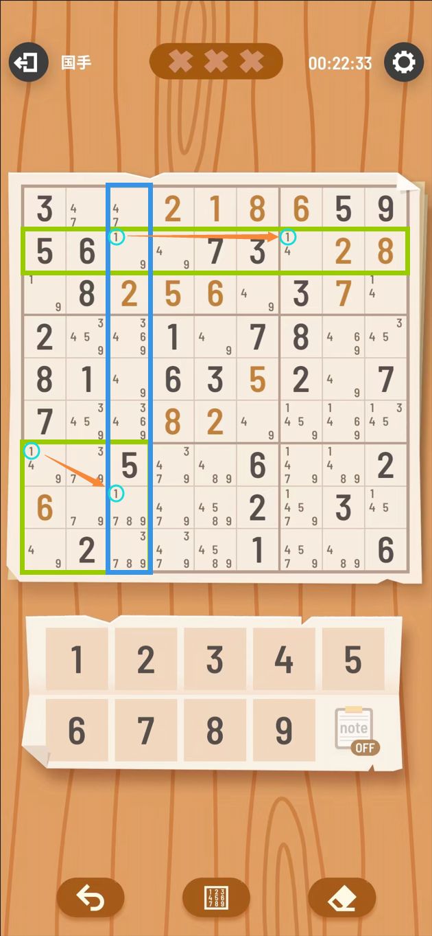 第3行中单元格R2C3和R2C7有候选数1。