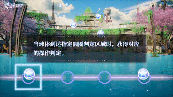 与音弦模式不同的是,流星模式为固定的4轨操作,键位固定,不会随机出现。圆形球体按键下落到达指定圆圈判定区域时按下,即可获得对应的操作判定。