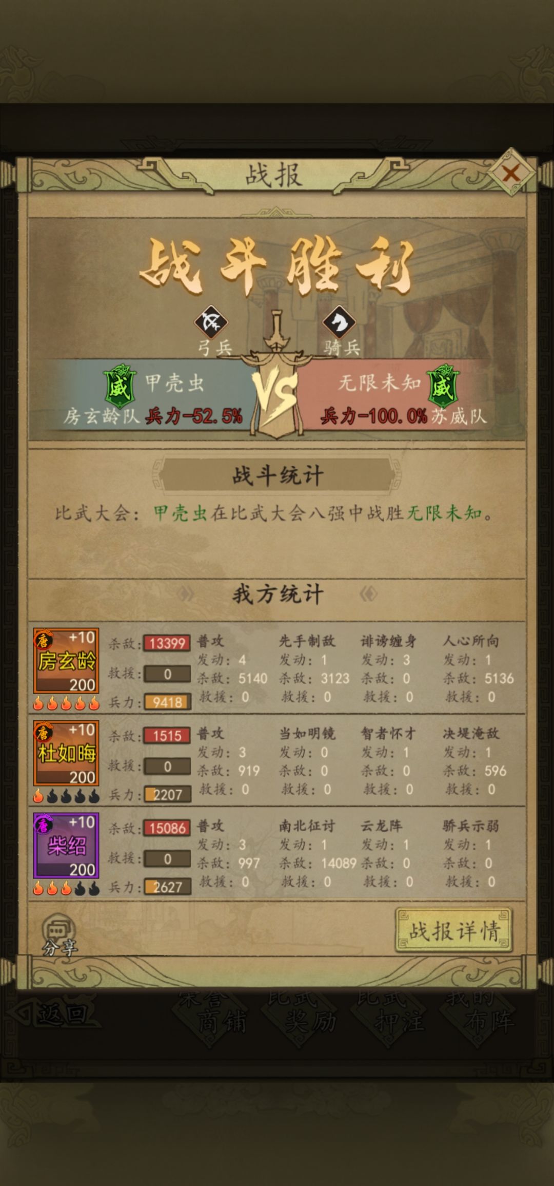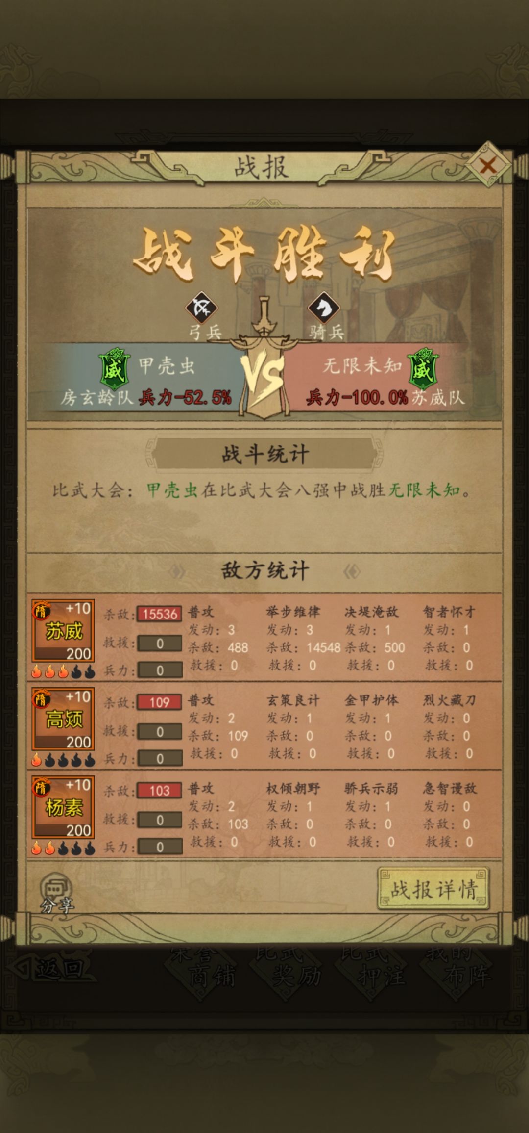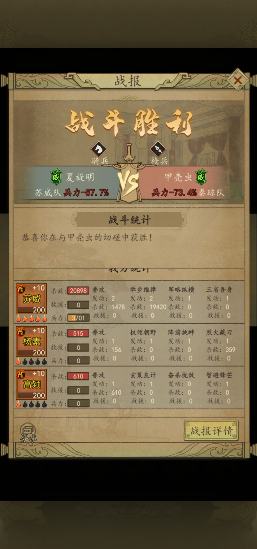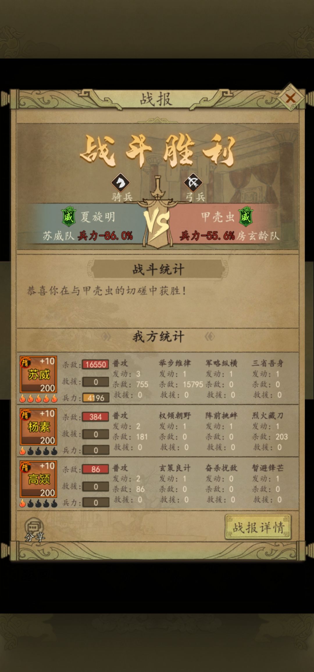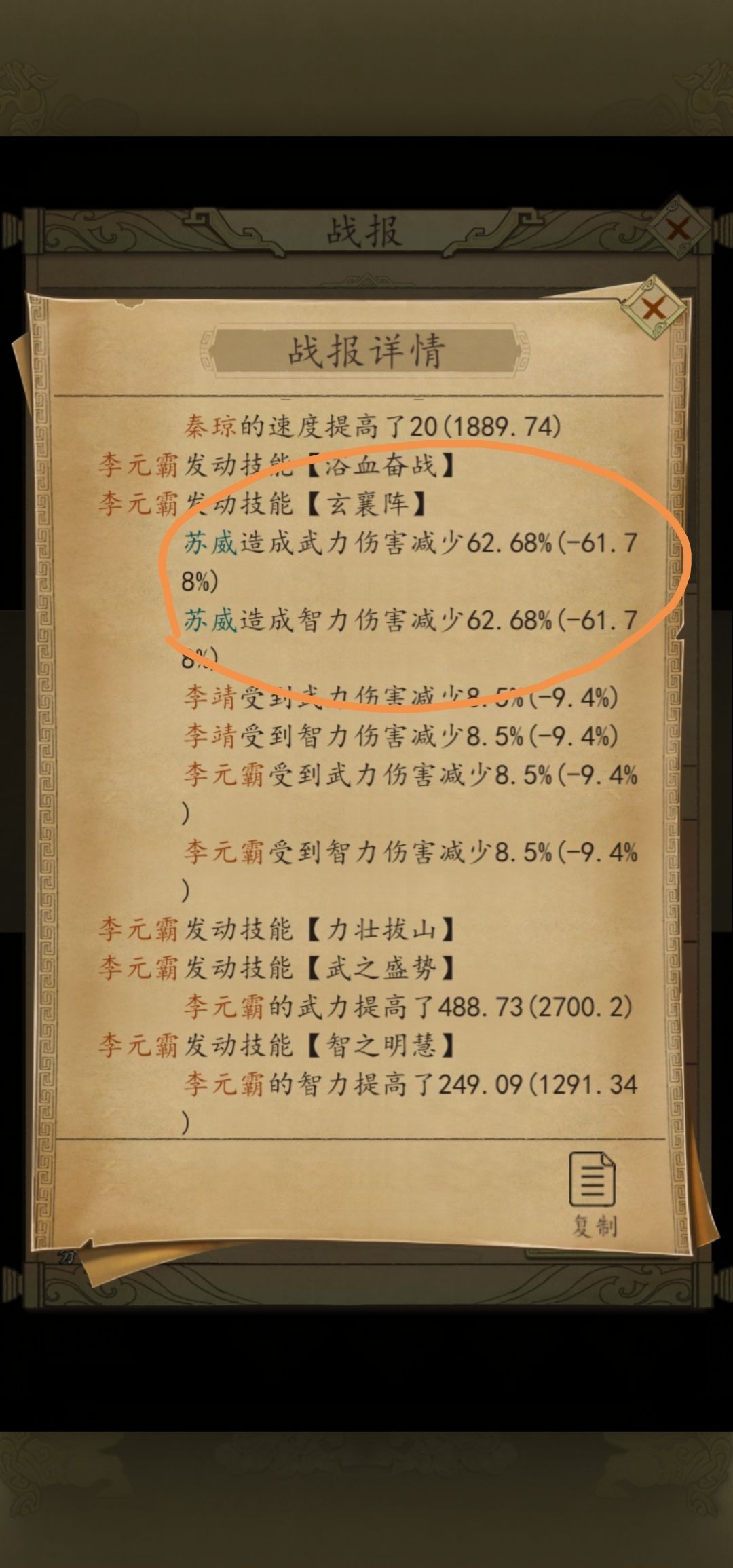 很多人都说我苏威打不动什么什么的浪费格子技能,我想说我给你推荐的是唯一一个下克上的队伍思路玩法,我具体的战况和将魂差距你们自己看就好了,别的我也不想说了。这就是为什么同样苏威我比对面慢为什么我赢,因为暂避这个技能覆盖是按照你行动为回合来算的,一回合一阶段可以拖到二回合六阶段结束相当于三回合持续减伤,所以单核减伤队伍越多的速度越慢越好。你又不是火烧弓,需要羽林军来集体先攻爆发俩回合。还是那句话多翻一翻战报,有些技能不翻战报你是看不出什么隐藏特效