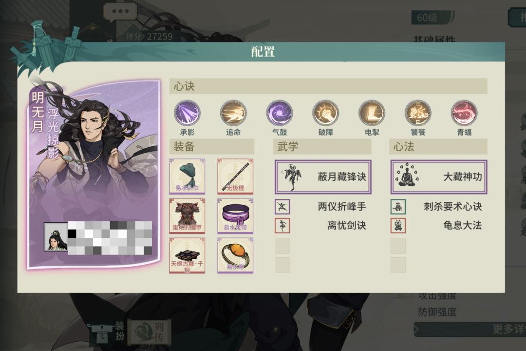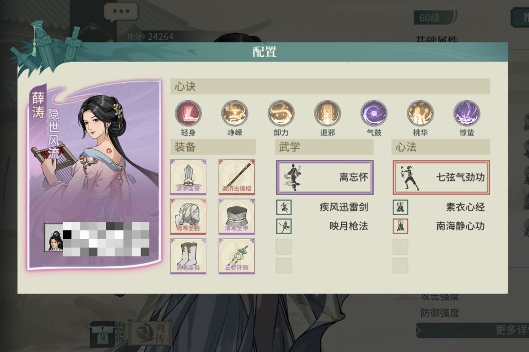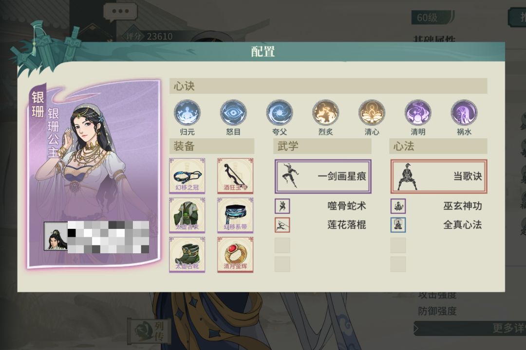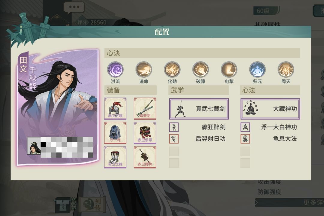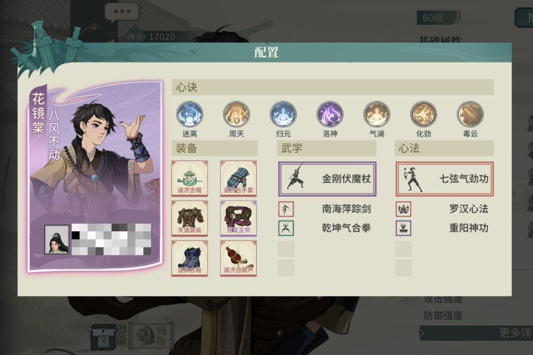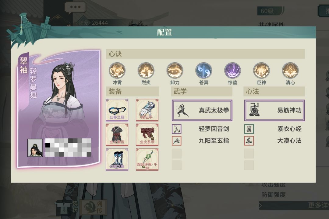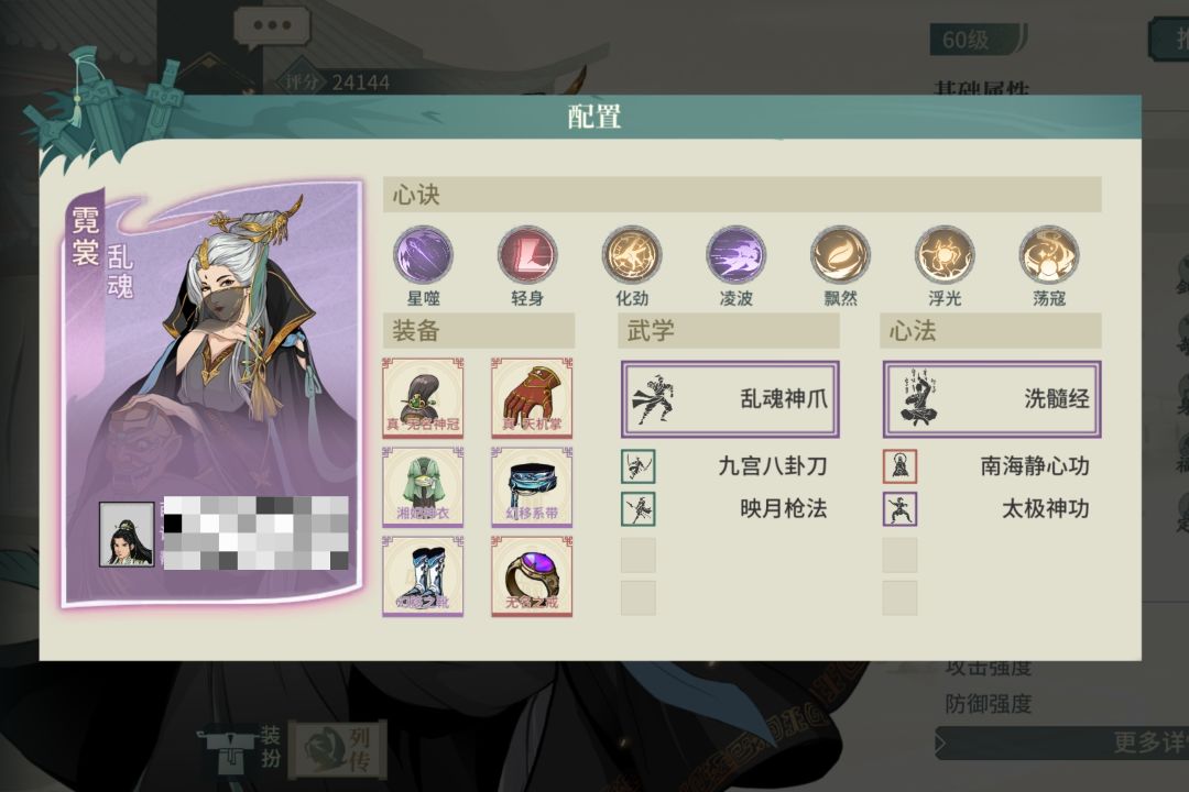 选择了一个不吃龟息又契合气宗的太极拳翠秀,饰品洗根骨没啥好说的,腰带洗身法,有60%的满减伤,心决实在没啥可选择的,就配了点火流刮痧,感觉还有优化空间。