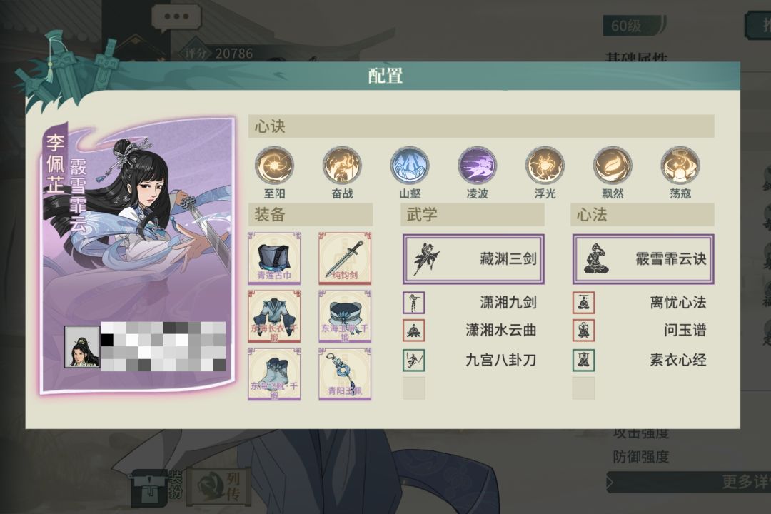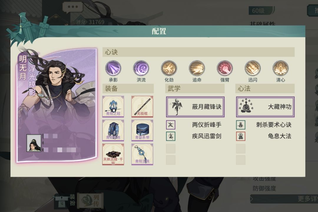 武学辅修没啥可说的,黑衣,离忧,列缺,还有一个虎啸枪的连击提升伤害上限。内功选择青云令抬高蓝量上限,以及回蓝量。不辅问玉谱选择辅大漠是因为这套气宗主角没破盾杀,所以用大漠的重伤来遏制护盾量。