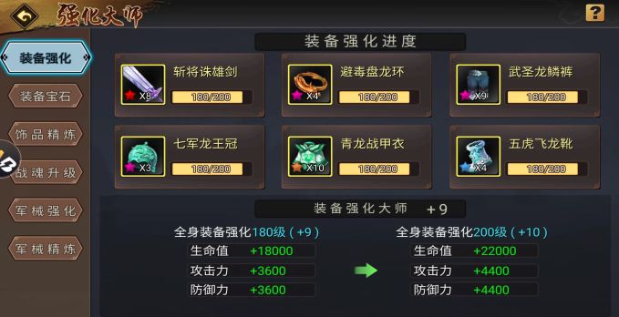 没有绝对全能的武将,可以胜任任何场景、任一游戏阶段,上述如此多的武将获取广度,游戏前期普通玩家不至于捉襟见肘,无将可用了。现在的新进玩家入门要“简单”很多!热衷竞技的新手玩家可以在将“开服基金”拿到手后,适当配置一位竞技强将,不过元宝用于提升装备,收益会更大,为征战高强度副本夯实基础。日常中也不要忽略主力武将内功的培养(突破、觉醒、升星),即使后续替换热门强将,一键“传承”也能轻松搞定。装备配置则建议大家按照强化大师慢慢培养,统筹兼顾,不要过于突出某一个点,而应该由点及面,同步、稳步去激活强化大师的属性加成。