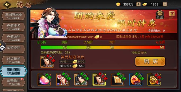 普通玩家元宝获取有限,一定不要盲目跟风,将存之不易的元宝去狩猎、古董探宝,后续古董令获取途径多,而且很多节日挑战任务都要会有古董探宝的既定任务。狩猎券团购7.5折,远比直接元宝狩猎性价比高。元宝要花在刀刃上,比如购买武将碎片和众多热门的养成材料,大可等到到团购活动或者大型节日活动的特惠商城,会是最低价。