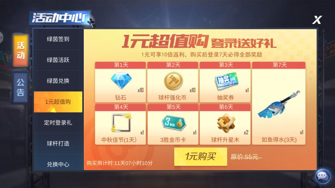 ⑤ 1元超值购:1元享10倍返利,连登7天必得超值福利物品:钻石*10颗、球杆强化币*10枚、抽奖券*1张、中秋佳节头像框(1天)、3胜金币卡*1张、球杆升星木*2枚、如鱼得水球杆体验3天。购买截止至2022年12月4日。