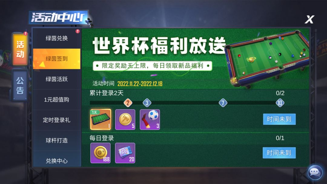 累计两天签到奖励:球桌体验卡1天、金币*5枚、魔法表情【接我一球】*3个