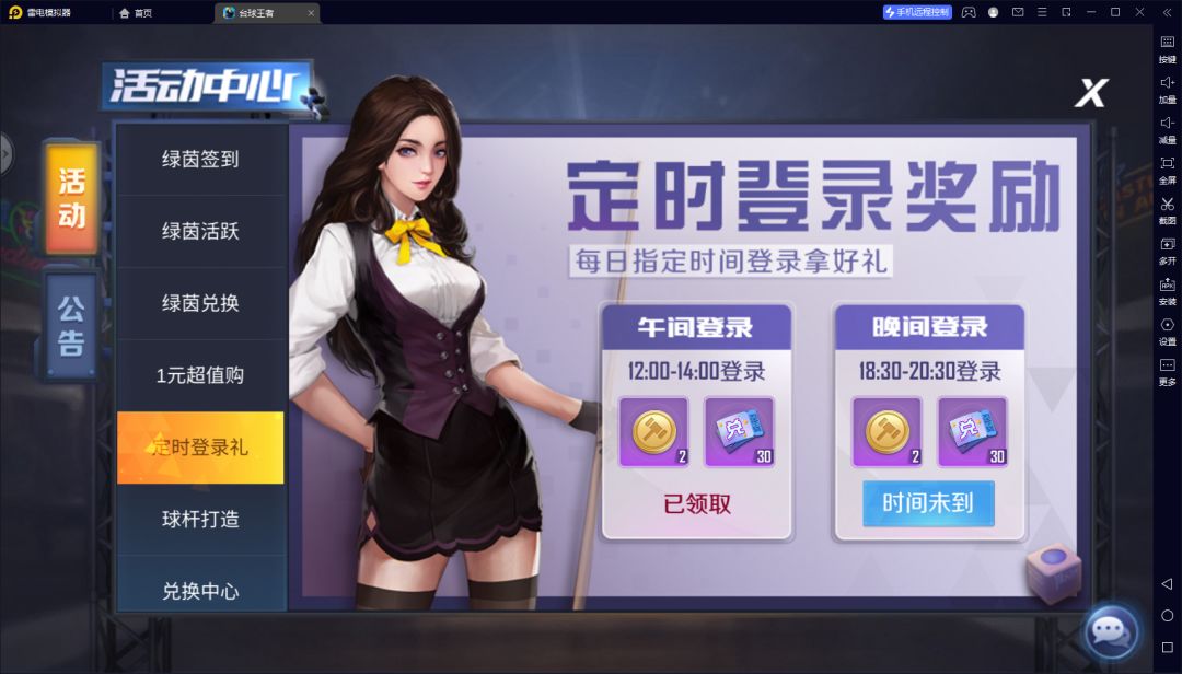 ④ 定时登录礼:每日午间登陆12点 - 14点或晚间登陆18点半 - 20点半,即可领取2枚球杆强化币和30张兑换券。
