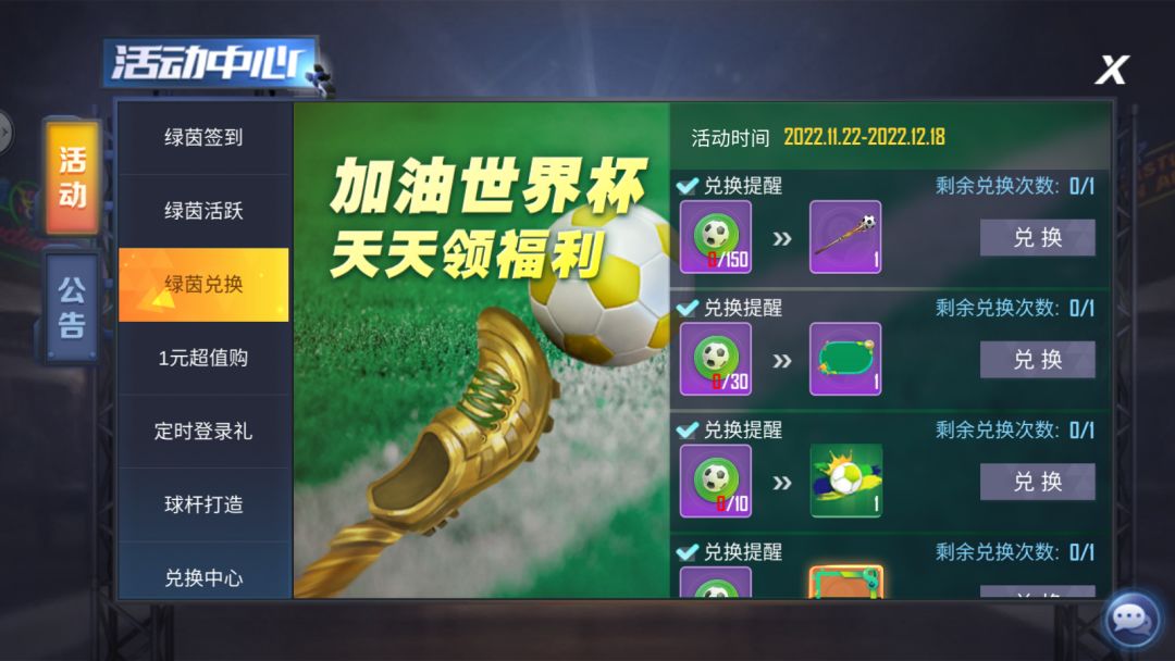 ③ 绿茵兑换:足球币可用于兑换物品:限定球杆(A级永久)、气泡(A级永久)、头像、头像框(S级永久)、表情礼包(2-4个对局互动表情)、球杆强化币(用于球杆升星)。