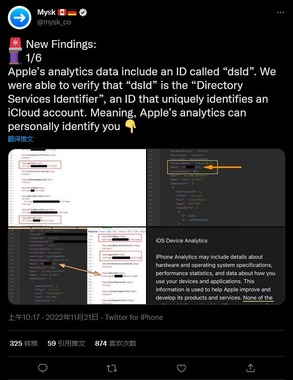 后续推文还指出,即使用户在设置中关闭设备分析,数据仍然会被发送,并且苹果也会在其他应用程序中发送用户的 DSID。在最后一条推文中,Mysk