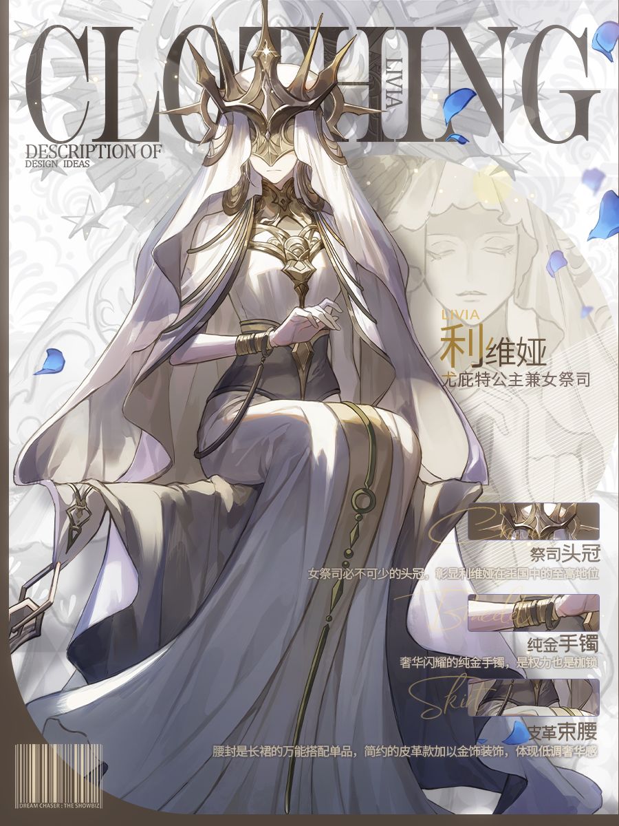 利维娅的造型没有使用细碎的小配饰,而是以量感十足的金饰装点圣洁的白色衣裙,打造庄重肃穆感。华丽沉重的金色头冠挡住了利维娅的眉眼,凸显了祭司的神秘色彩,世人可以向神祷告,但拯救众生的却不一定是神明。