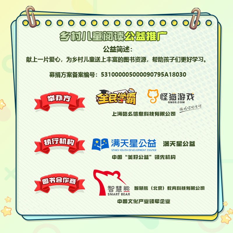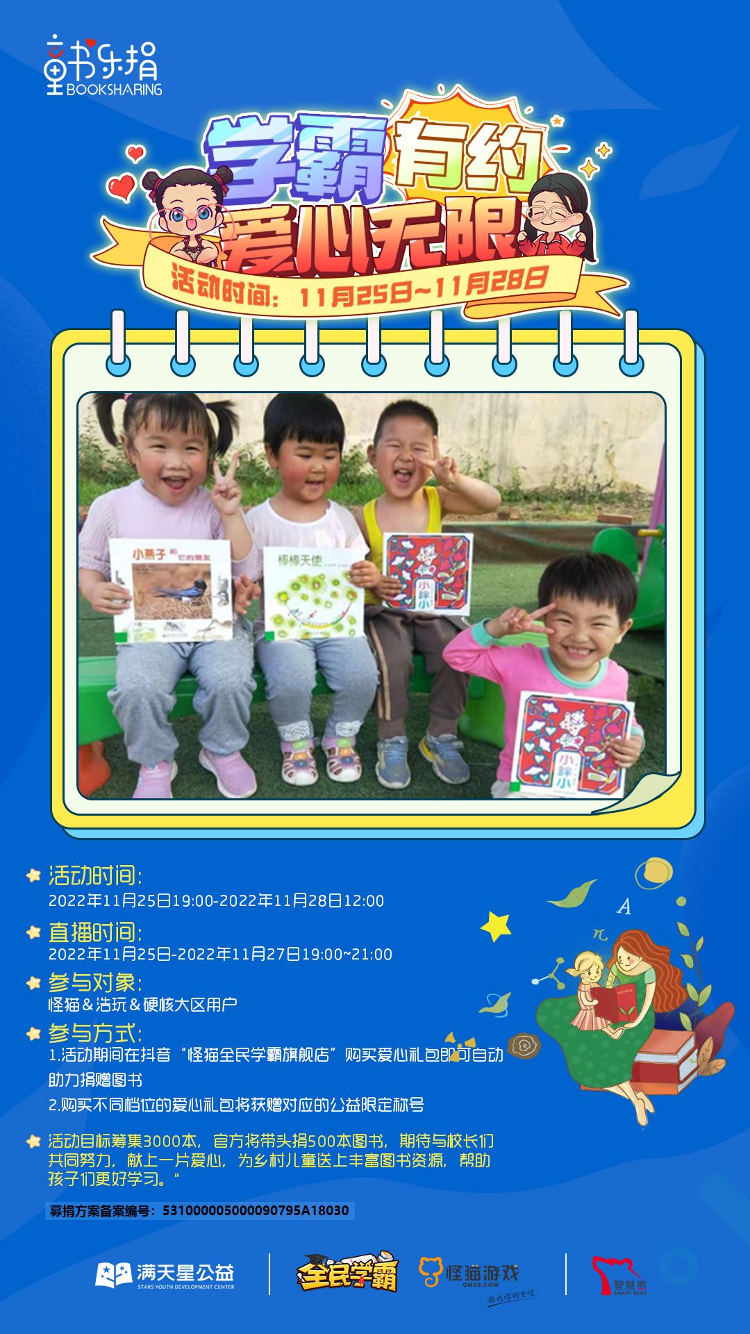 为了丰富乡村儿童的阅读资源,给山里的孩子们带去温暖和关怀,2022年11月25日至11月28日,“全民学霸”携手中国文化产业领军企业“智慧熊”、中国美好公益领先机构“满天星”,发起“童书乐捐”计划。