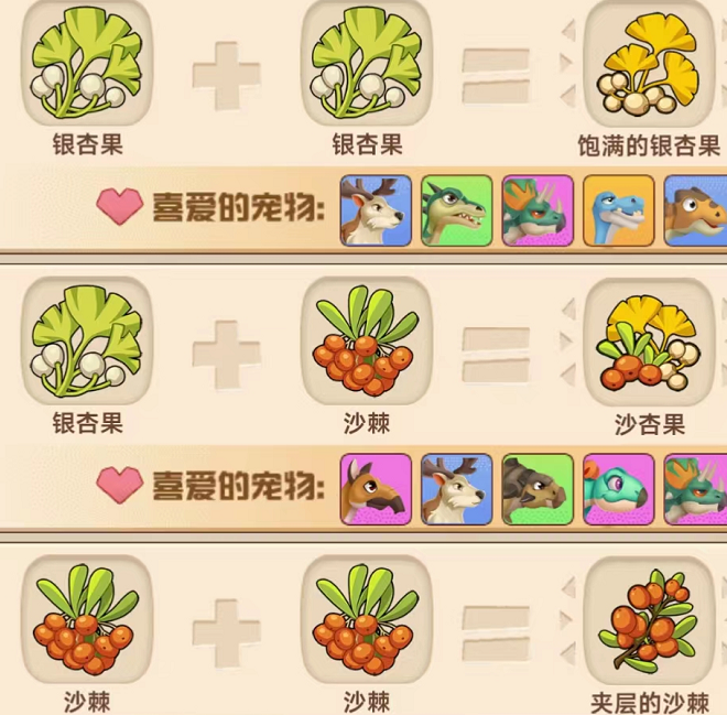 20、银杏果 + 沙棘 = 沙杏果,喜爱的宠物:长颈驼,大角鹿,甲龙,三角龙,剑龙,辽宁龙