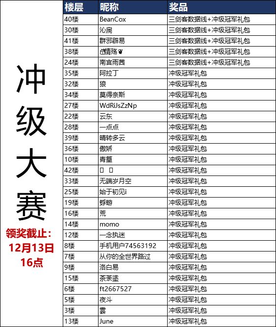 冲级冠军:活动结束后,等级最高的5位少主将获得【三剑客数据线】*1+【冲级冠军礼包】