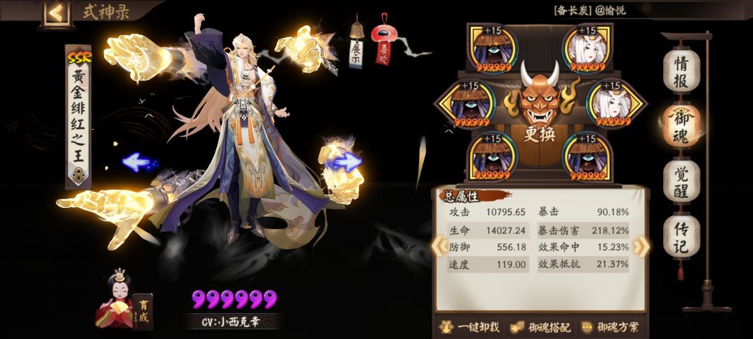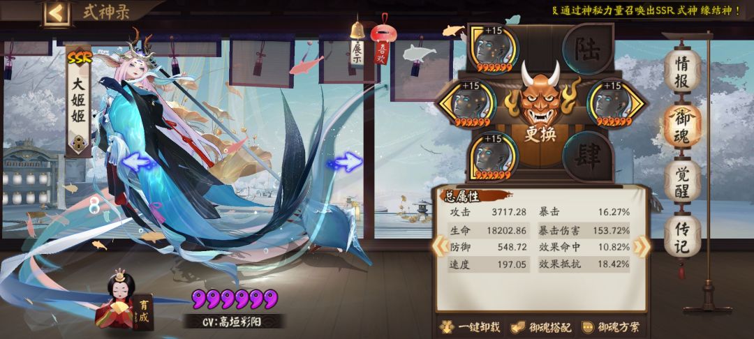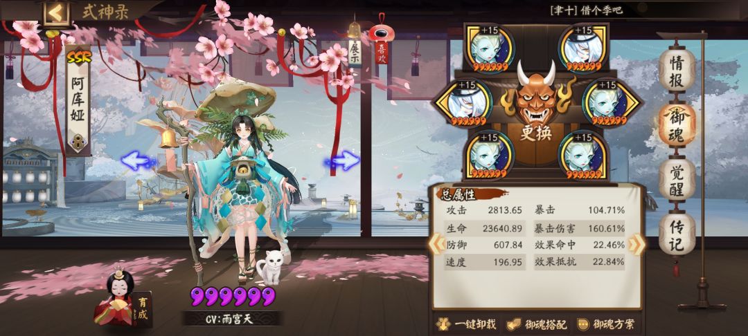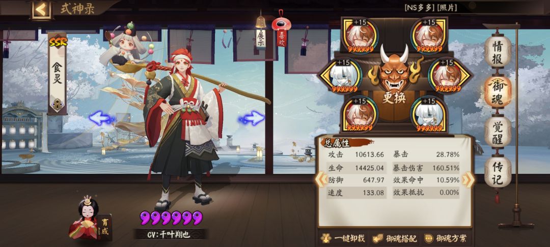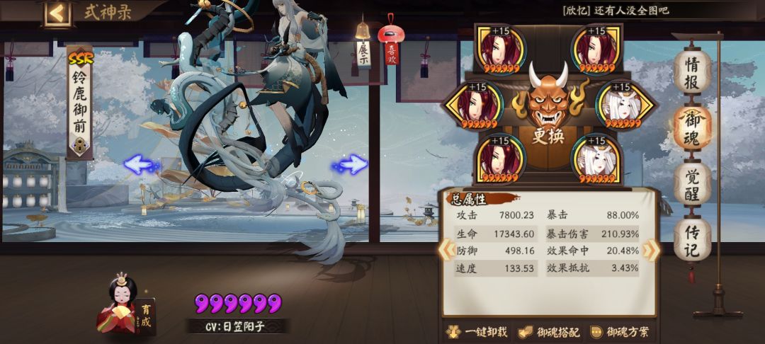 不见岳平替,简单粗暴40%增伤,配合食灵用也还行,把不见岳下了换上缘结神,通关速度没有慢太多,御魂就随便带吧,最好也就遗念火/招财了,速度大于主c。