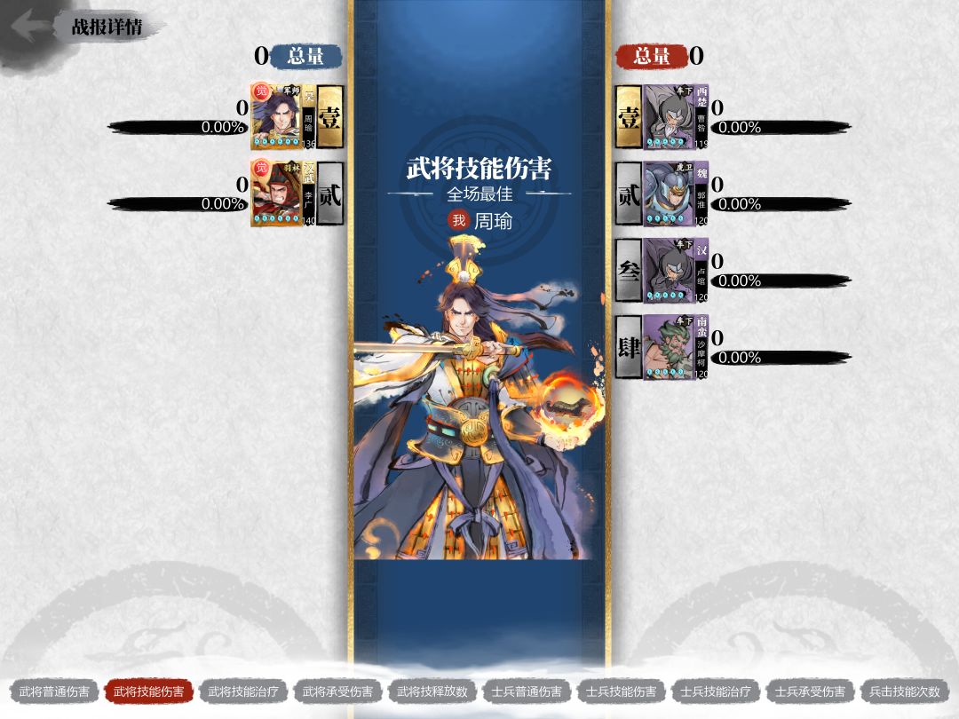 周瑜战法每5秒施加一次灼烧,战斗进行了29秒,应该触发5次。但实际并未观察到触发的特效,战后统计中周瑜的技能伤害也为0。由此可知