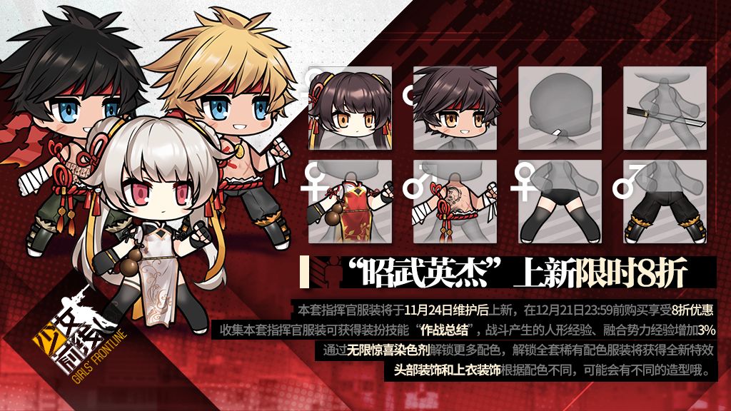 #少女前线# #指挥官服装上新# 亲爱的指挥官们,服装商城将在11月24日维护后上架指挥官全新服装“昭武英杰”,在12月21日23:59前购买可享受八折优惠。收集本套指挥官服装可获得服装技能,通过“无限惊喜染色剂”还可解锁更多配色,解锁全套稀有配色服装将额外获得特效!指挥官服装特效已与套装分离,指挥官可以自由选择穿戴已收集的服装特效!拿出勇气,来一场彼此全力以赴的战斗吧!