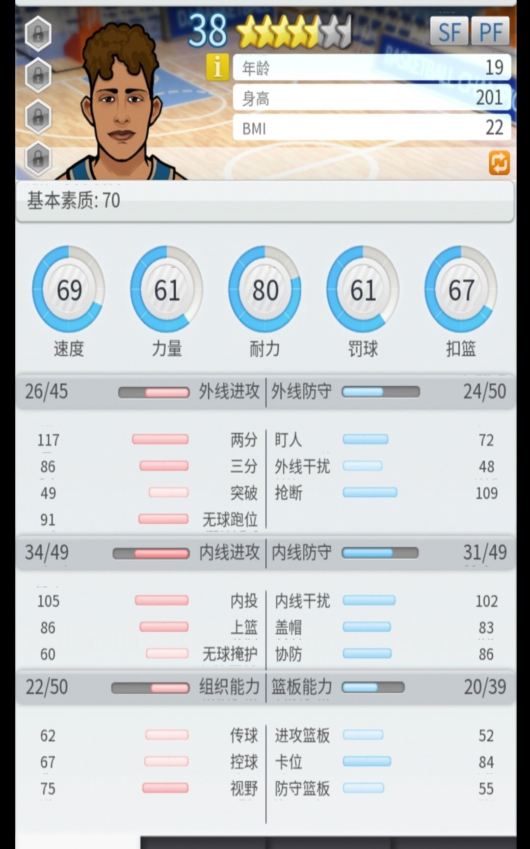 注意:对于蓝领,身体素质也很重要,力量尽可能需要70+,条件差的最低为60+(这样就只能打pf了,打c防守比较亏)。