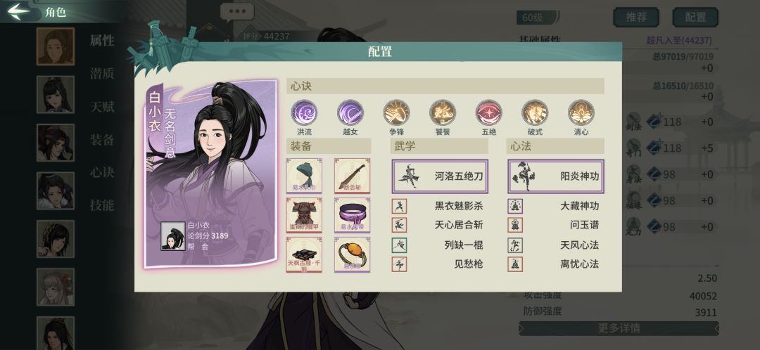 心决改动:断念斩加破式心决可以替换追命加流氓刀。因为河洛刀过高的技能威力会导致双追命(追命加天心居合斩)攻击残血敌人时伤害溢出,攻击满血敌人时伤害不够,所以改为减防御与提高攻击伤害,心决饕餮可以提供一定的续航,虽然比不上刀魔的吸血,但是聊胜于无,没有的话选出速推阵容的时候容易暴毙。对于河洛刀这种暴力输出的主角来说,辅助心决的选择要自私一点,清心>退邪>荡寇。