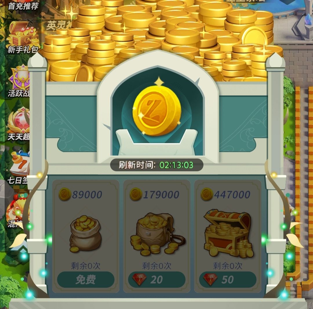 杂货商店的6小时挂机金币资源宝箱(30钻一个)可以刷新第一次免费,后面50钻累加(特别缺钱时用)