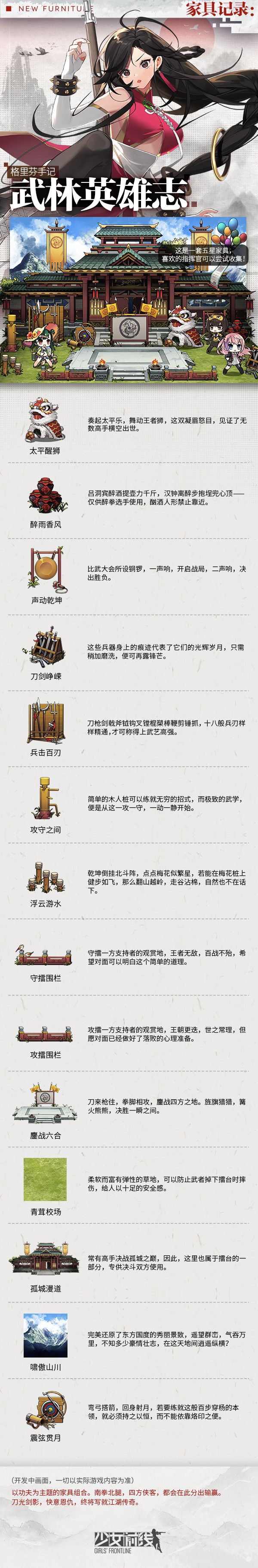 #少女前线# 亲爱的指挥官们,现在为大家带来2022年全新采购主题“侠女风云录”中出现的全新五星家具“武林英雄志”!南拳北腿,四方侠客,都会在此分出输赢;刀光剑影,快意恩仇,终将写就江湖传奇。详细介绍请见下图!