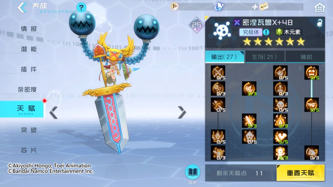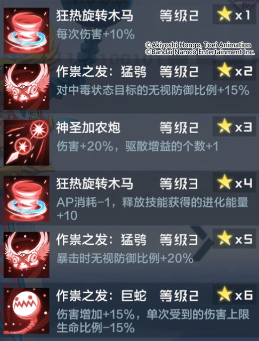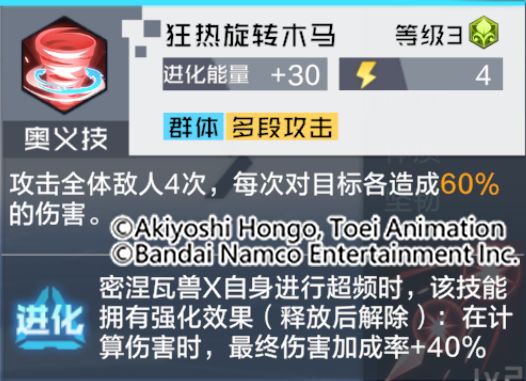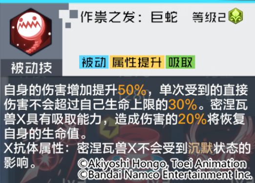 通过技能解析可以看出,密涅瓦兽X具备独特的技能效果,通常技可以百分百概率驱散目标增益状态,奥义技则是能够对全体敌人造成多段攻击,得意技更是可以在暴击时,无视敌人一定百分比的防御力,并额外无视中毒目标的防御属性。被动技能使密涅瓦兽X不会受到沉默状态的影响,同时还能提升自身伤害。除此之外,单次受到的直接伤害,不会超过自己生命上限的指定百分比。密涅瓦兽X具有吸取能力,造成伤害的一定百分比将恢复自身的生命值。可以说是非常强大的群体输出类型数码宝贝,相信密涅瓦兽X在队长的阵容编队里会有不错的表现!