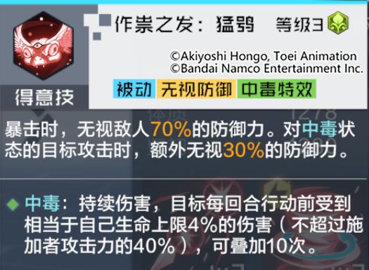 技能解析:攻击产生暴击时无视目标大量防御,对中毒状态的目标攻击时则额外追加无视一定比例的防御。升星后最多可无视敌方100%的防御力。