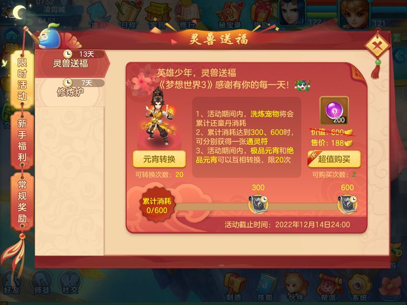 2)灵兽送福:11月24日维护后-12月14日24:00,活动期间洗炼宠物累计消耗一定数量还童丹可获得通灵符;极品元宵和绝品元宵可以互相转换,限20次;