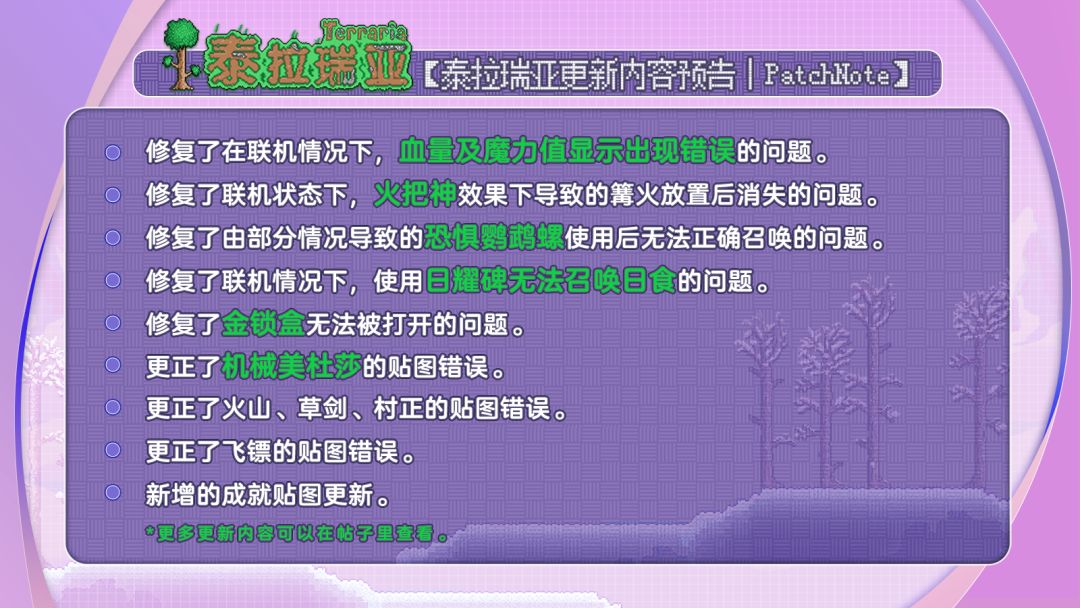 修复了用微光转变物品时产生坠落之星,这些坠落之星会在白天期间立即消失的问题。此外,正在被玩家“拾取”过程中的坠落之星不再会在白天期间消失。